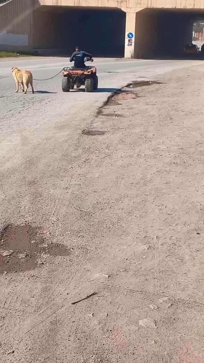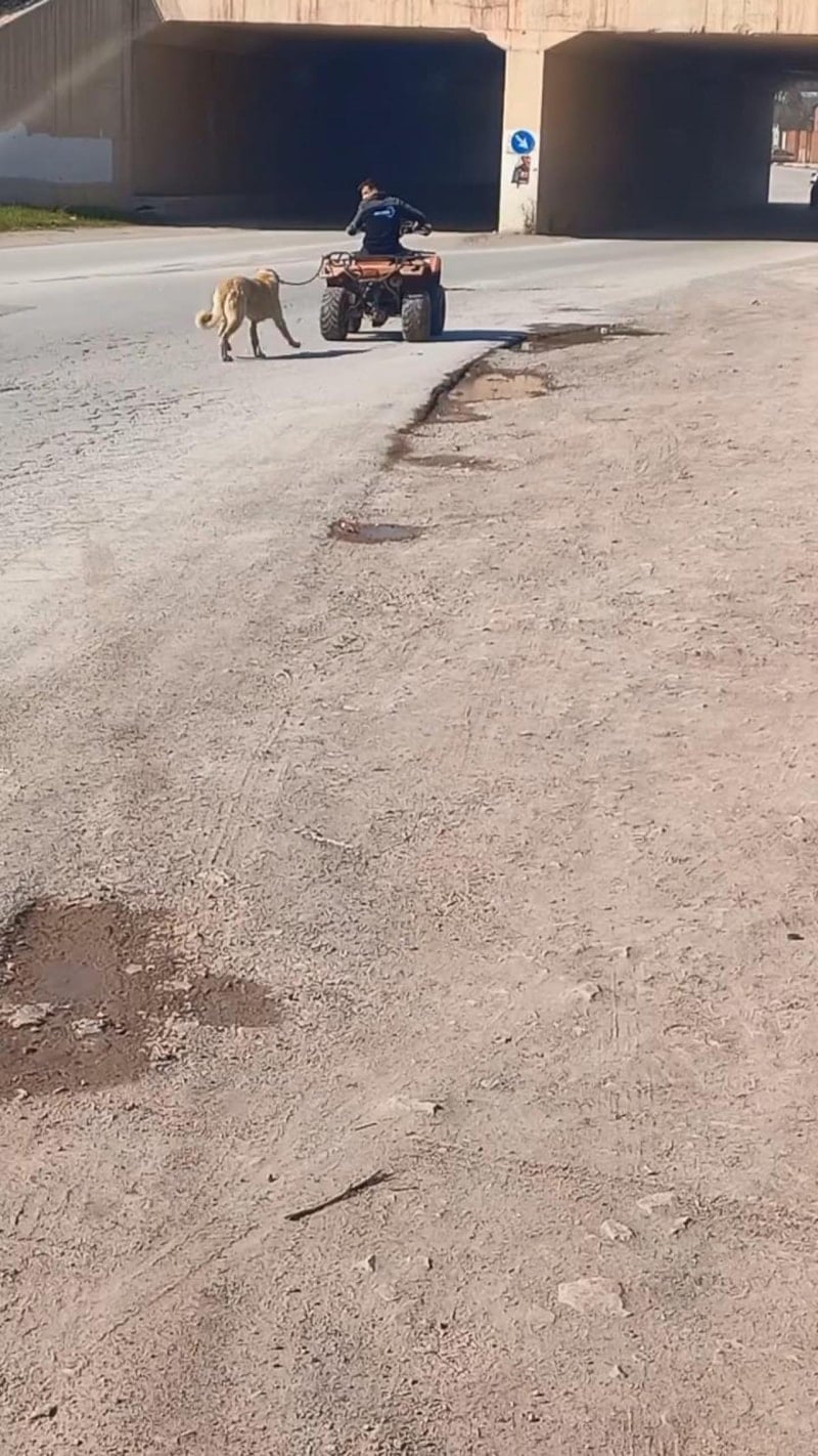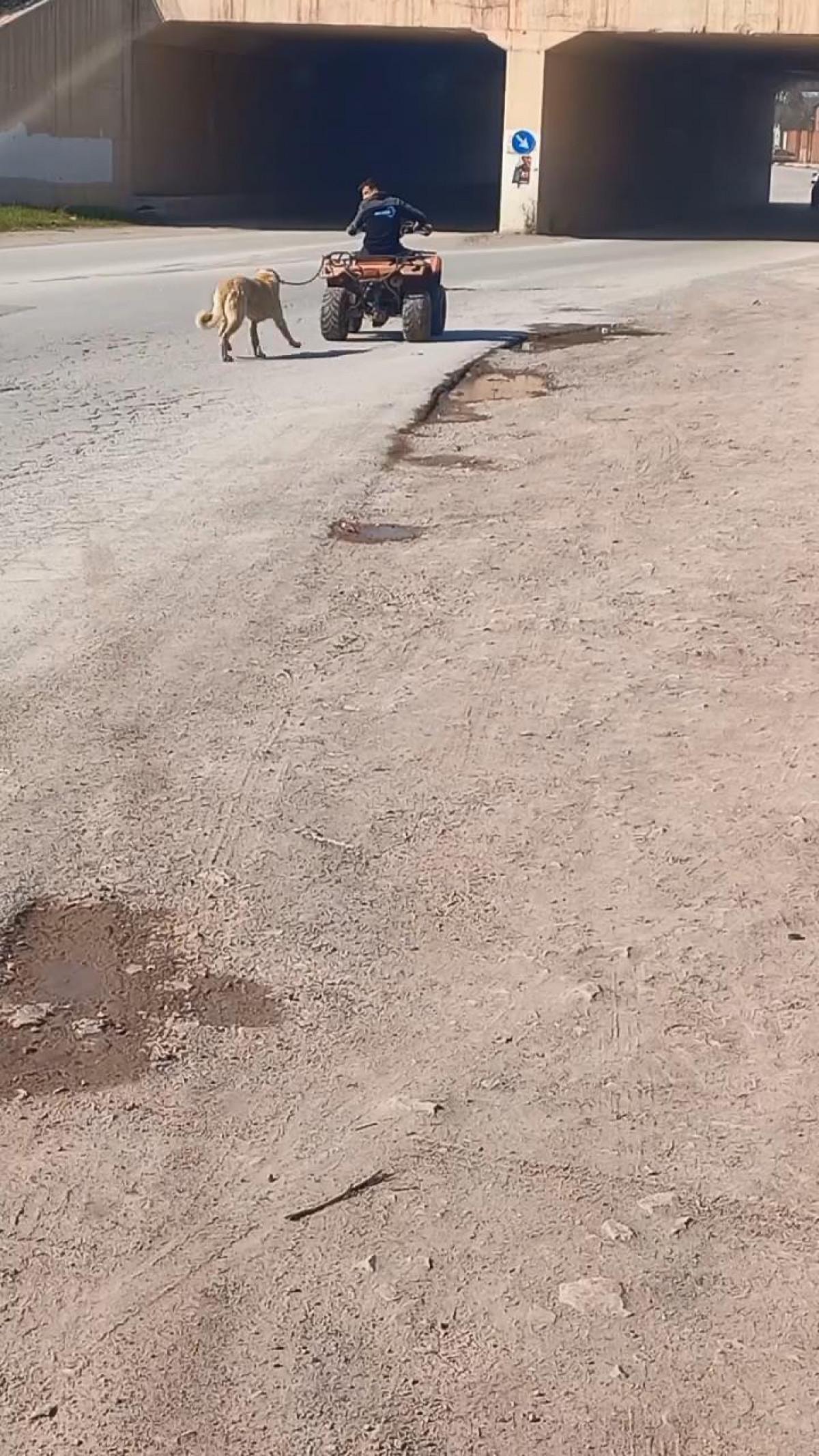 Bir kişi, kangal cinsi köpeğini ATV motoruna bağladı. Daha sonra motorunu çalıştıran kişi, hareket ederek köpeği sürükledi.