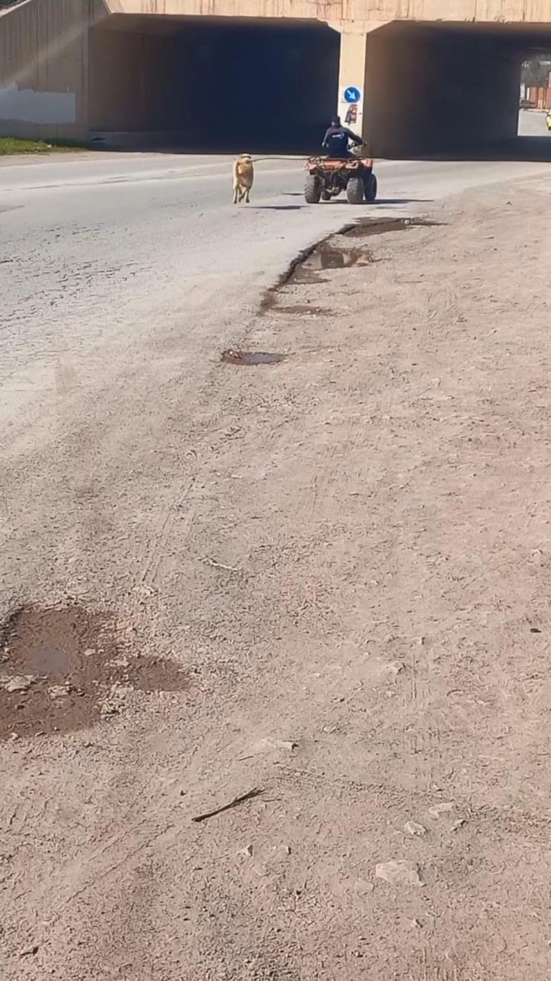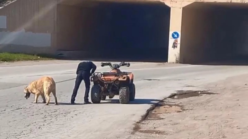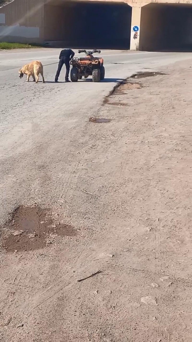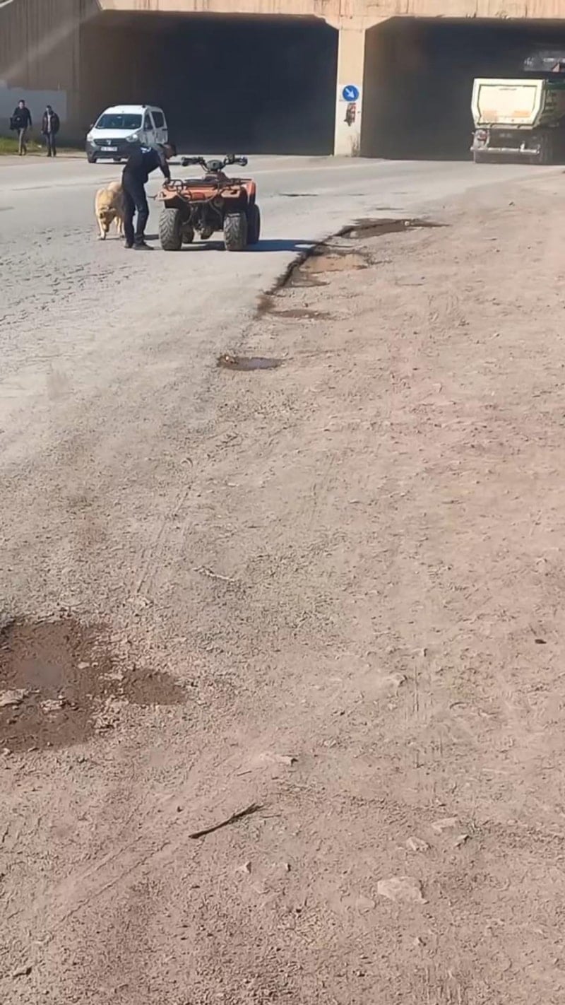 Bir kişi, kangal cinsi köpeğini ATV motoruna bağladı. Daha sonra motorunu çalıştıran kişi, hareket ederek köpeği sürükledi.
