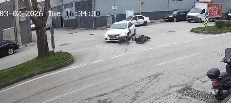 Osmangazi ilçesinde bir otomobil kontrolsüz şekilde dönüş yapmak isteyince motosikletle çarpıştı. Kaza anı güvenlik kameralarına yansırken olayla ilgili inceleme başlatıldı.