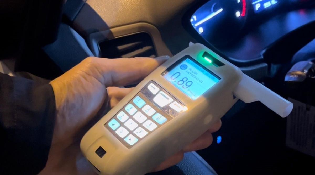 Alkolmetreyi kendi eline alan Hüsne Ş., son denemede başarılı olunca 0.89 promil alkollü olduğu ortaya çıktı.