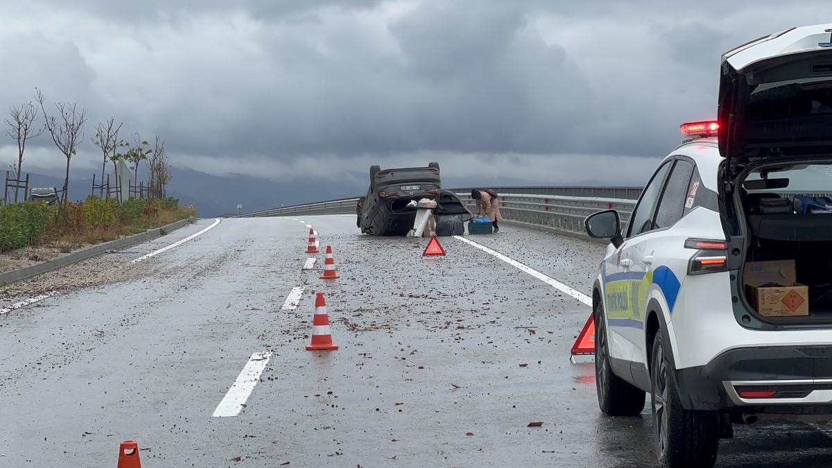 Sürücüsünün direksiyon hakimiyetini kaybettiği otomobil, refüje çarpıp takla atarak yaklaşık 100 metre sürüklendi. Sürücü Vural Y. ile araçta bulunan eşi S.Y. (52) ve çiftin çocukları A.Y. (29), kazadan hafif sıyrıklarla kurtuldu.