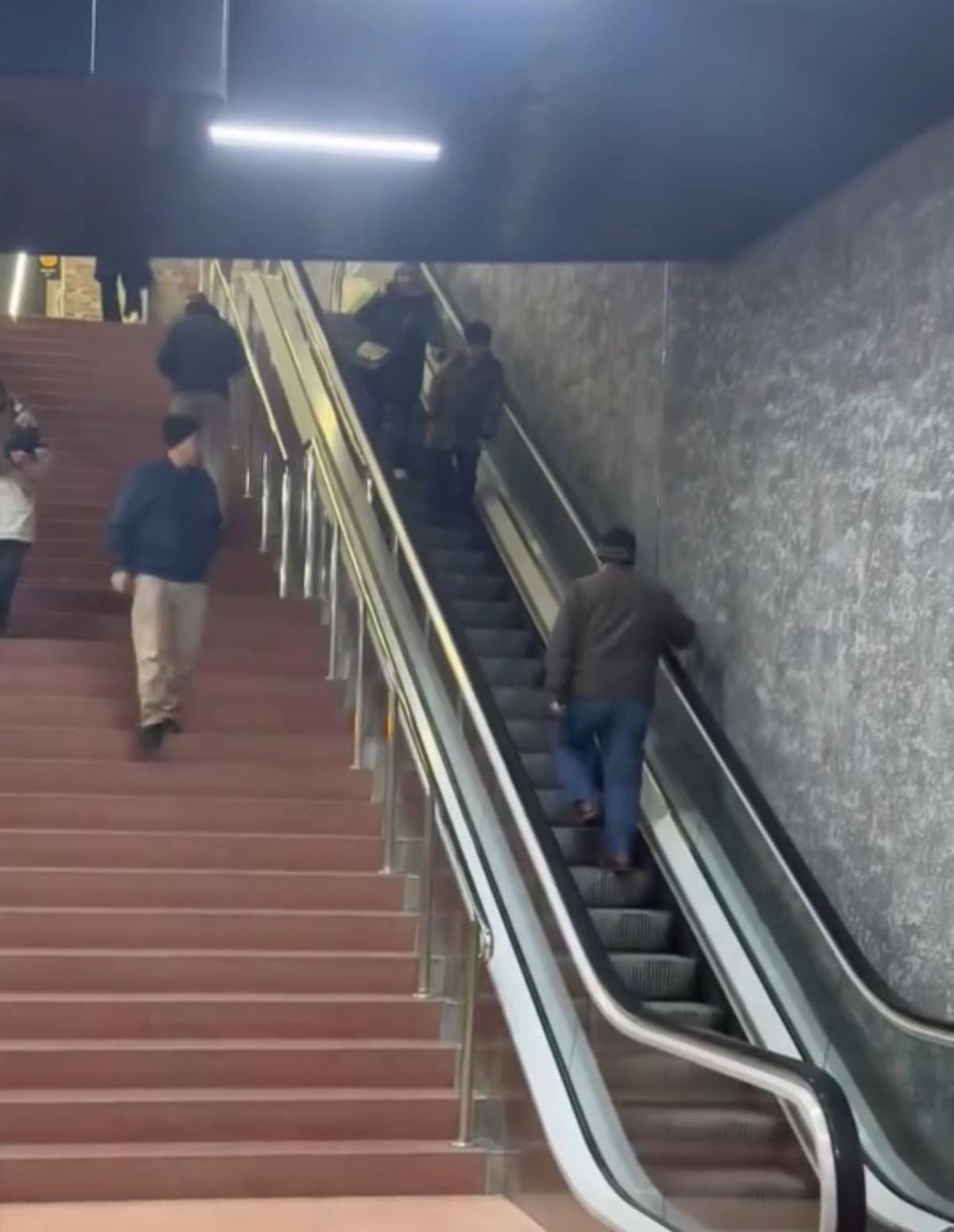 Fakat bindikten bir süre sonra çalışan yürüyen merdivenler aşağı yönde hareket edince mağdur olan vatandaş, dakikalarca ters bindiği yürüyen merdivenden yukarı çıkmak için uğraştı.