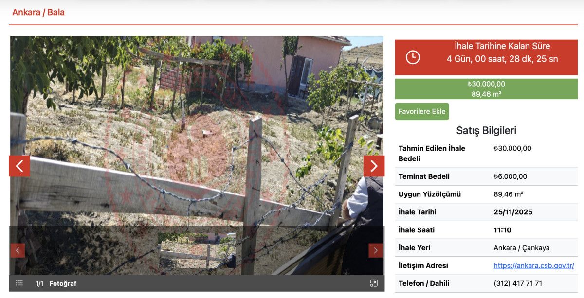 En son duyurulan ihale listesine göre Ankara’da 30 bin TL’ye arsa, 52 bin TL’ye ise tarla satılacak.