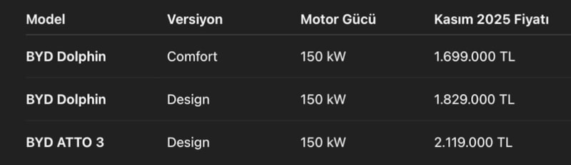 DOLPHIN VE ATTO 3 FİYAT LİSTESİ