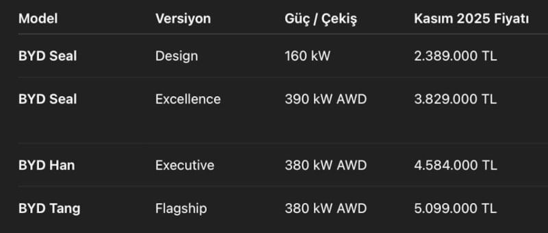 İşte Kasım 2025 BYD fiyat listesi: