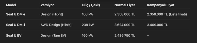 Yeni dönemde Dolphin ve ATTO 3 modelleri fiyatlarını korurken, üst segmentteki modeller için özel kampanyalar dikkat çekti.
