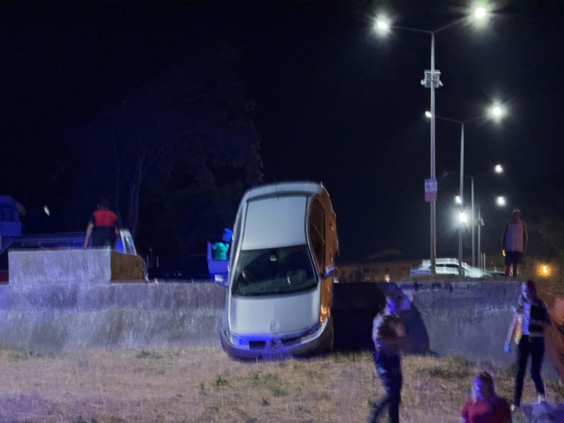 Araç, yaklaşık 2 metre yükseklikteki duvardan aşağı düşerek havada asılı kaldı.