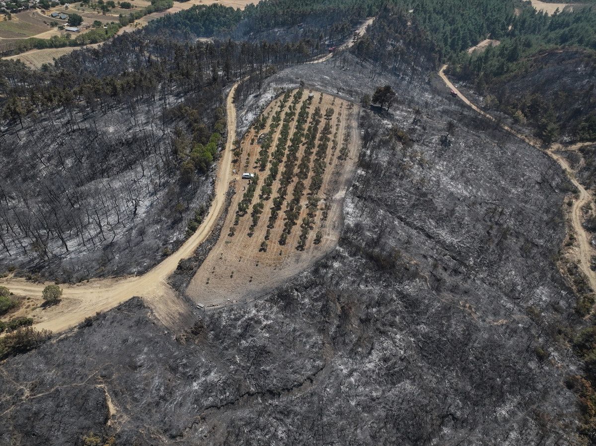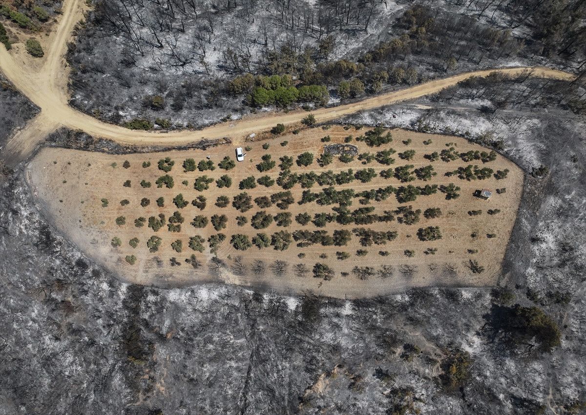 Zeytinliğin etrafındaki her yer küle döndü. Zeytinliğim ağaçların altı temiz, alanın sürülmüş ve bakımlı olması nedeniyle zarar görmedi. Sadece yangının sıcaklığı nedeniyle birkaç ağaç zarar gördü. Ormana yakın olan ağaçların bazıları hafif zarar gördü. Biz önceden önlemimizi almıştık. Sürdük, bakımını yaptık. Etrafı temizdi. Çevresi temiz olmasaydı tamamen yanardı, kül olurdu.