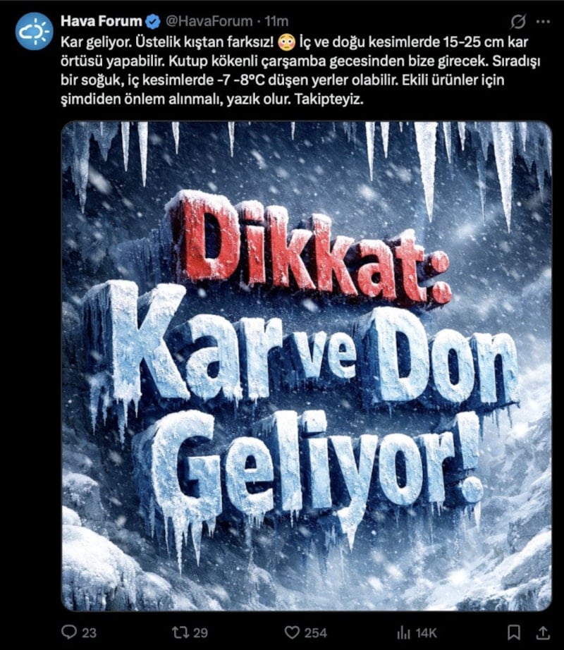 “Kar geliyor. Üstelik kıştan farksız! İç ve doğu kesimlerde 15-25 cm kar örtüsü yapabilir. Kutup kökenli çarşamba gecesinden bize girecek. Sıradışı bir soğuk, iç kesimlerde -7 -8°C düşen yerler olabilir. Ekili ürünler için şimdiden önlem alınmalı, yazık olur.”