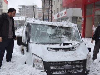 Muş'ta Cumhuriyet Caddesi'ndeki bir iş yerinin önünde park halinde bulunan, özel firmaya ait 23 BJ 519 plakalı otomobilin üzerine, binanın çatısında biriken kar kütlesi düştü.