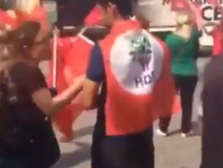 Amatör kameraya yansıyan görüntüde HDP bayrağını boynuna bağlayan bir kişi CHP bayrağını sallıyor.