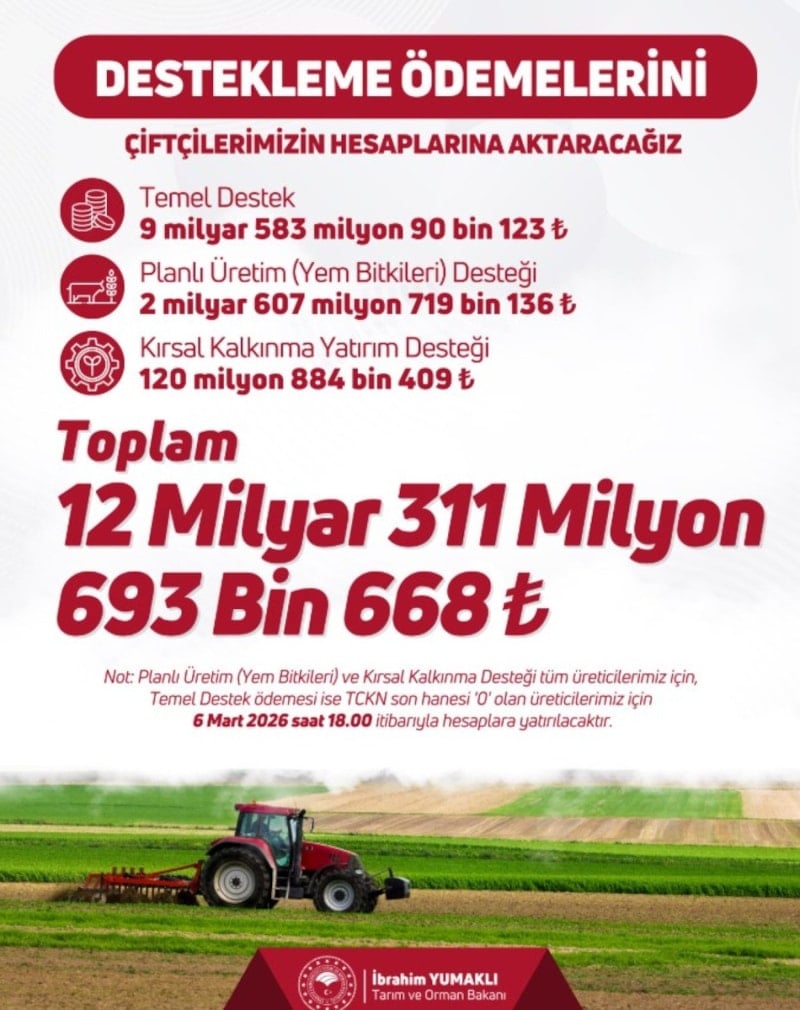 Tarım ve Orman Bakanı İbrahim Yumaklı, 12 milyar 311 milyon liralık tarımsal destekleme ödemelerinin bugün hesaba yatırılacağını duyurdu.