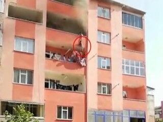 Çocukları yangından alt kata sarkıtarak kurtardı VİDEO