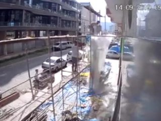 Öte yandan, iskelenin çökme anı da binanın güvenlik kamerasına yansıdı.