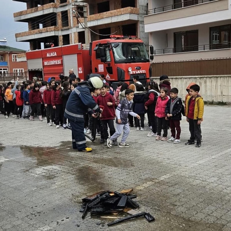 Çorum’un Alaca ilçesinde itfaiye ekipleri tarafından öğrencilere yangın eğitimi verildi.