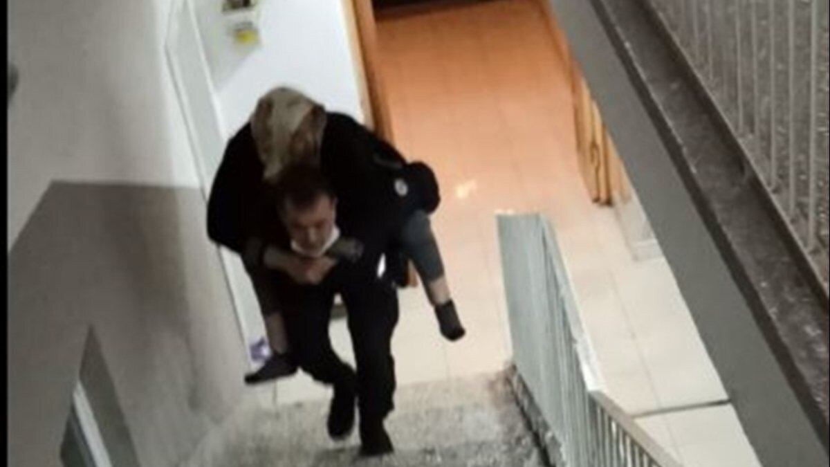 Polis memurunun fedakar davranışı, diğer apartman sakinleri tarafından cep telefonuyla görüntülendi.