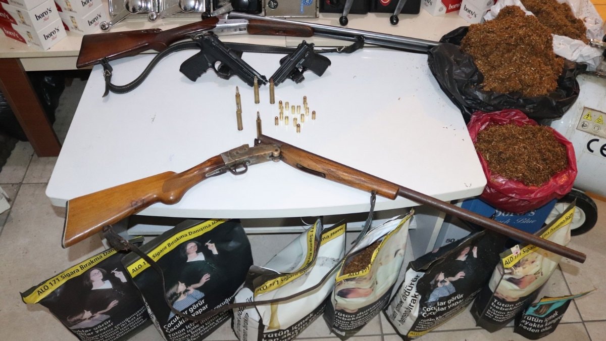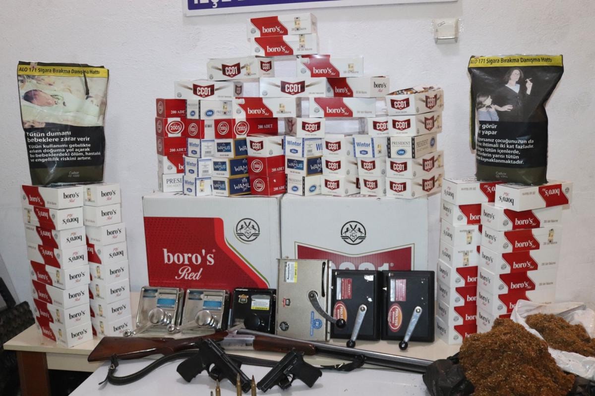 Aramada 2 adet ruhsatsız av tüfeği, 2 adet kurusıkı tabanca, 311 adet fişek, 2 adet sigara sarma makinesi, 6 adet manuel sigara sarma makinesi, 4 bin adetl içi kaçak tütün doldurulmuş makaron sigara, 10 bin 400 adet kaçak boş makaron, 11 kilogram kaçak kıyılmış tütün ele geçirildi.