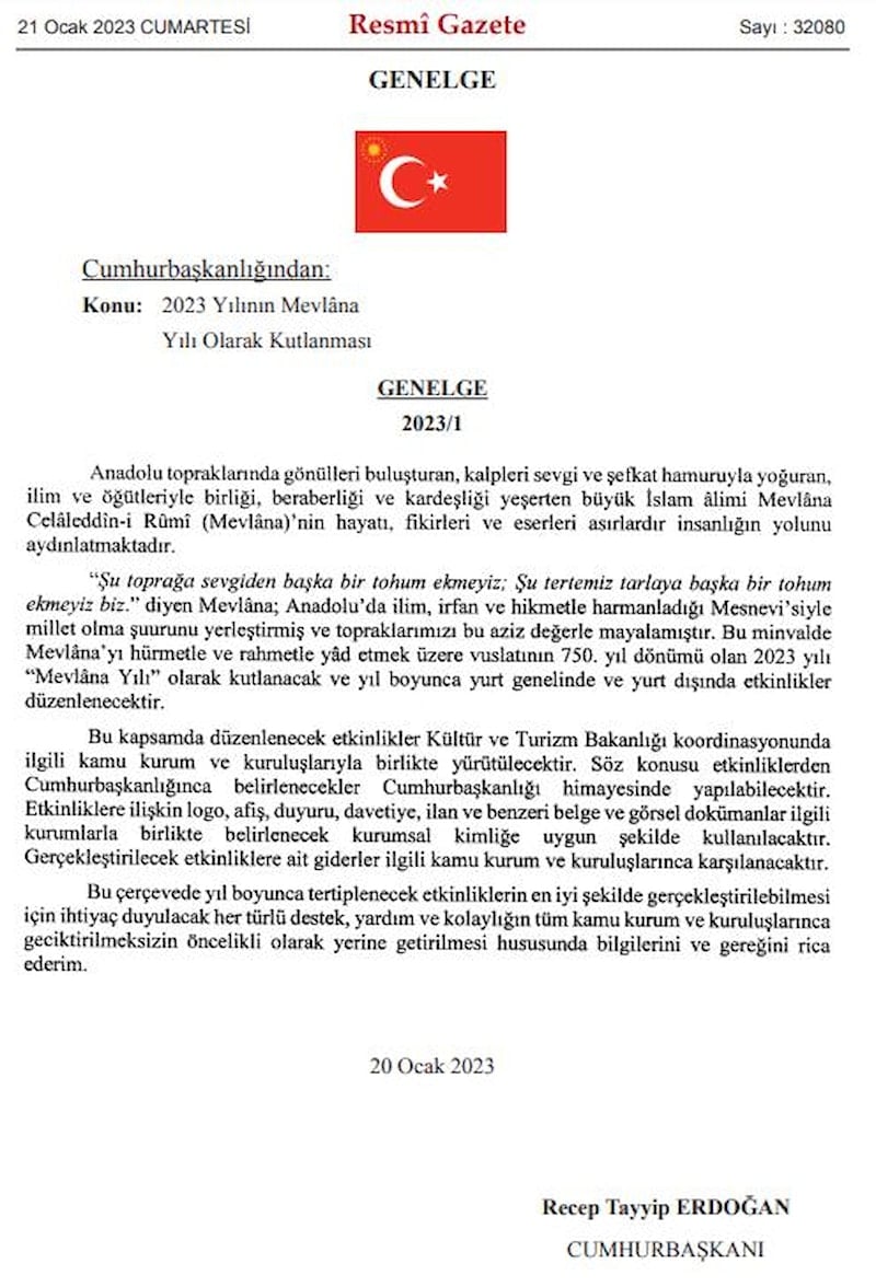 2023 yılının "Mevlana Yılı" olarak kutlanmasına ilişkin genelge, Cumhurbaşkanı Recep Tayyip Erdoğan tarafından yayınlandı.