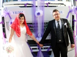 Dorsesi çıkarılıp Türk bayrakları ve renkli şeritlerle süslenerek gelin arabası yapılan tırın direksiyonuna geçen Yaşar Karataş (24), konvoyla Yıldıztepe Mahallesi Dumlupınar Caddesi'nde oturan gelin Yıldız Erayık'ın (23) evine geldi.