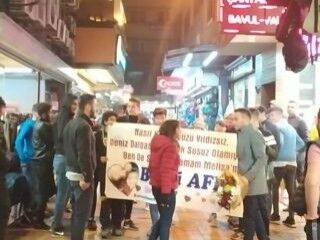 Arkadaşlarıyla birlikte sloganlar atan genç, kız arkadaşının çalıştığı iş yerine davul ve meşaleler eşliğinde giderek af diledi. Yapılan sürpriz karşısında şaşkınlığını gizleyemeyen kız arkadaşı ise Mert Uzun'un bu güzel jestine, affederek karşılık verdi. İki çılgın aşığın duygu dolu anlarına, çevredeki vatandaşlar da alkışlayarak destek verdi.
