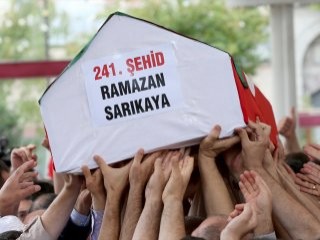 Ramazan Sarıkaya'nın Türk bayrağına sarılı tabutu, cenaze töreninin düzenlendiği Fatih Camisi'ne getirildi. Tabutun üzerine, Kelime-i Tevhid yazılı örtü ile "241. şehit Ramazan Sarıkaya" yazısı konuldu.