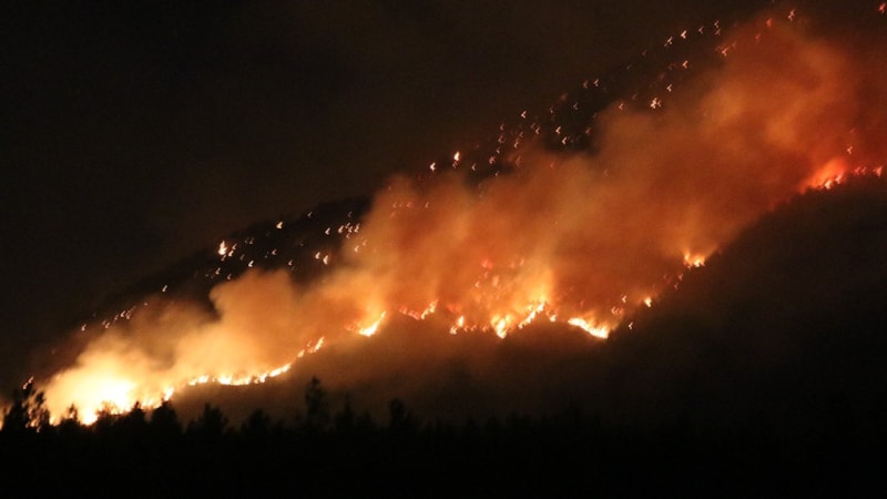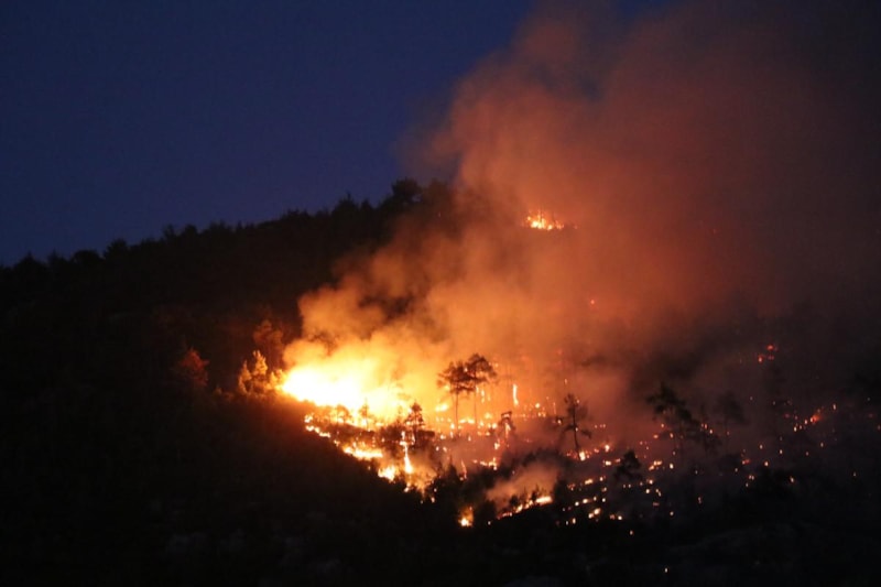 Orman yangınına havanın kararmasıyla uçak ve helikopterlerin havadan müdahalesi sona erdi. Karadan ise ekiplerin müdahalesi devam ediyor.