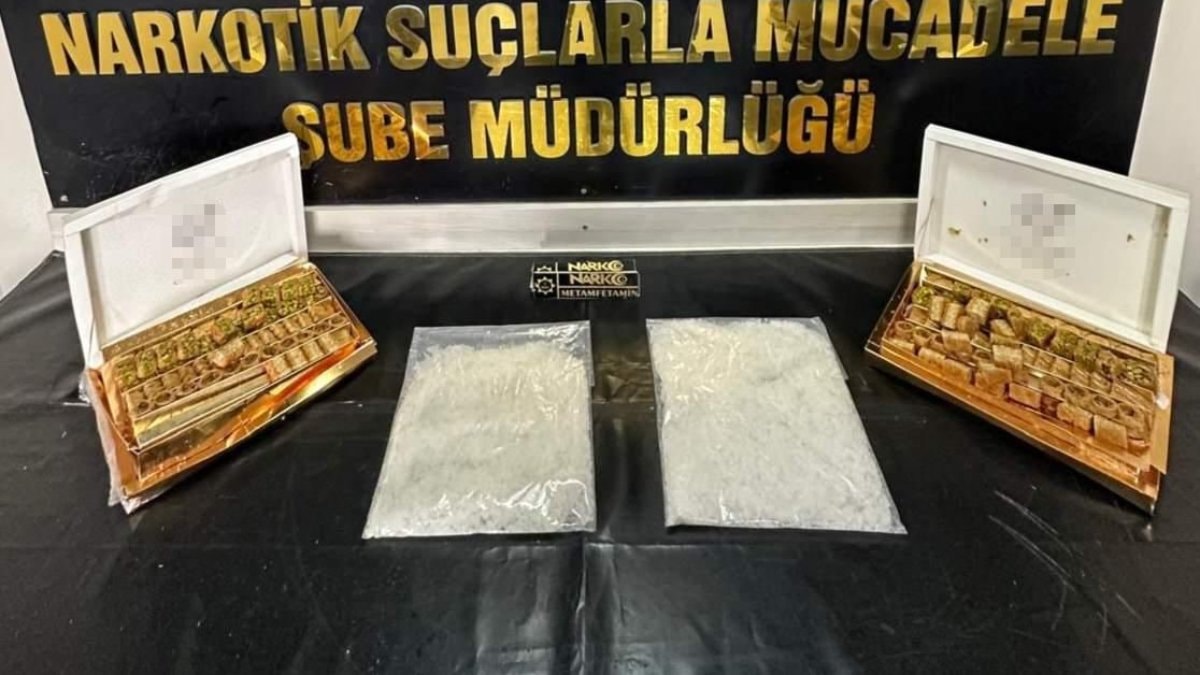 Şahıs üzerinde ve eşyalarında yapılan aramalarda, tatlı kutuların altına gizlenmiş şekilde 1 kilo 500 gram metamfetamin maddesi ele geçirildi.