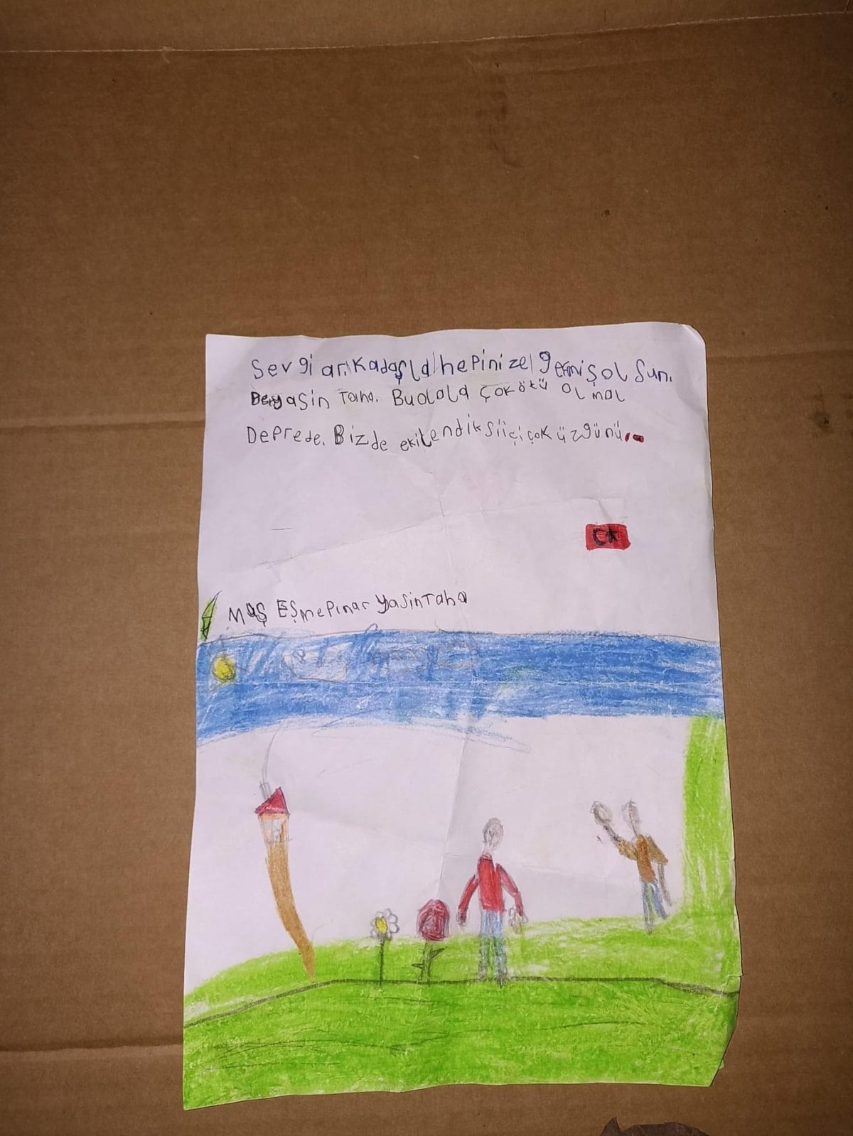 Minik Yasin Taha tarafından kaleme alınan Mektupta, “Sevgili arkadaşlar hepinize geçmiş olsun. Ben Yasin Taha, oralar çok kötü olmuş. Depremde biz de etkilendik sizin için çok üzgünüz” yazdı.