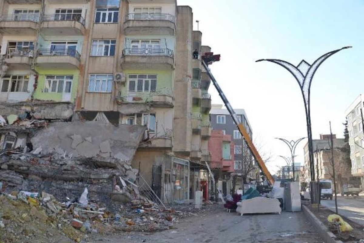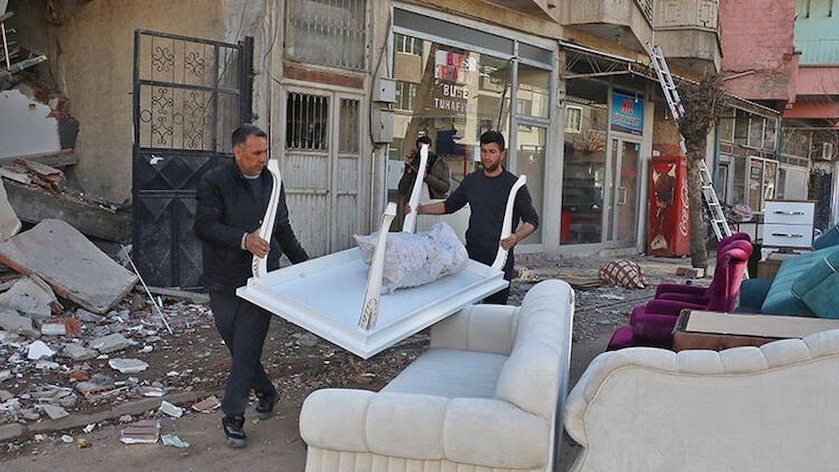 Kahramanmaraş'ın Pazarcık ve Elbistan ilçelerinde meydana gelen 7.7 ve 7.6'lık depremde büyük yıkım yaşayan Adıyaman'da ekiplerin hasar tespit çalışmalarının ardından depremzedeler; orta ve ağır hasarlı ya da acil yıkımına karar verilen binalarda ve yapıların altındaki iş yerlerinden eşyalarını tahliye ediyor.