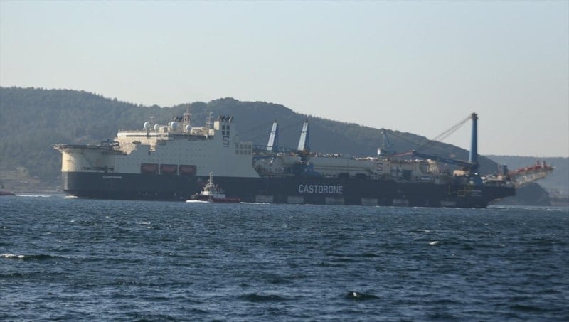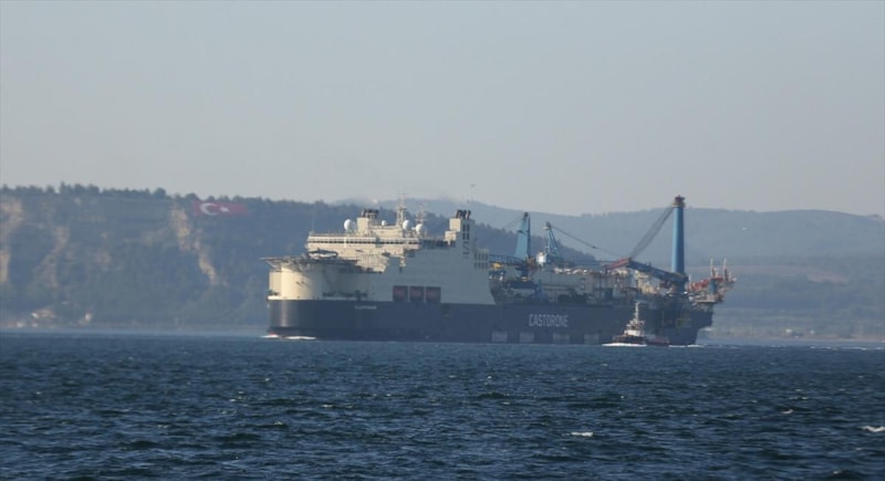 Türkiye'nin Karadeniz'de keşfettiği doğalgaz için boru döşeyen "Castorone" gemisi, Çanakkale Boğazı'ndan geçti.