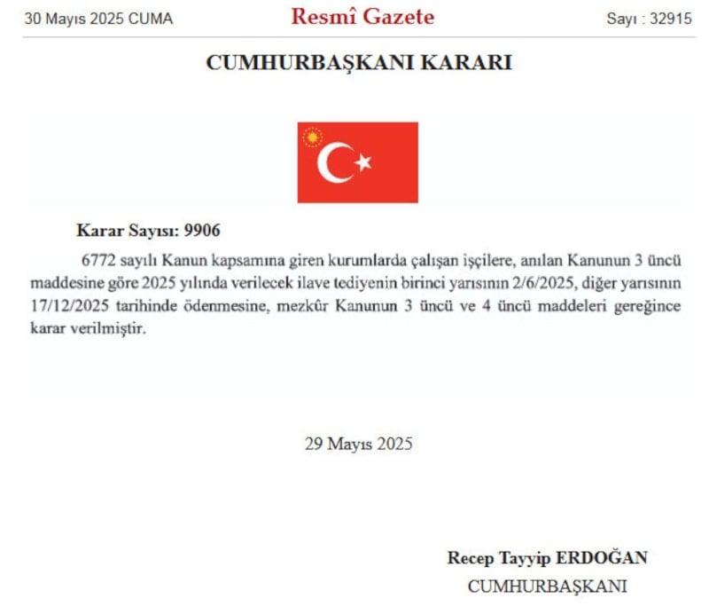 Karara göre, 6772 sayılı kanun kapsamına giren işçiler, anılan kanunun 3’üncü maddesine göre 2025 yılında verilecek ilave tediyenin birinci yarısını Kurban Bayramı'ndan önce 2 Haziran tarihinde diğer yarısını ise 17 Aralık'ta alacak.