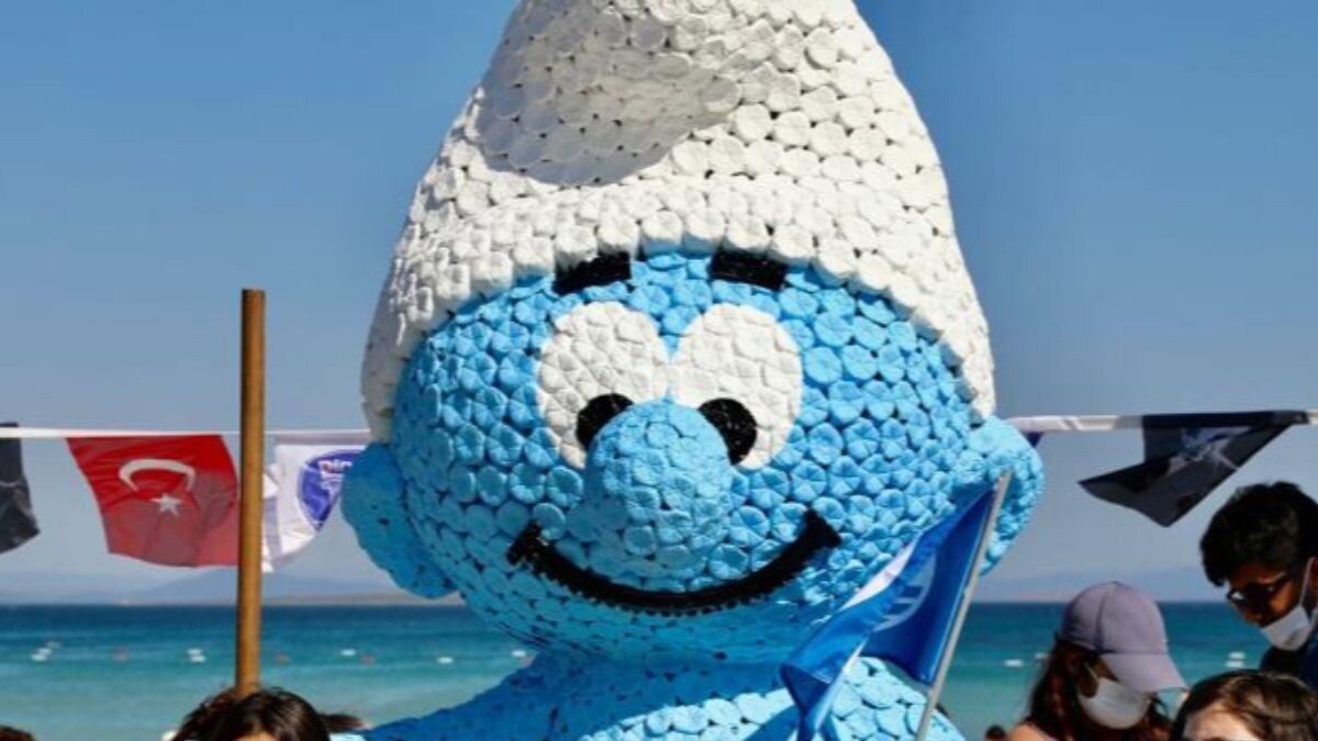 Toplanan atıklar, Didim Belediyesi'nin Heykel ve Seramik Atölyesinde boyanarak, çizgi film karakteri olan "Şirinler" heykeline dönüştürüldü.