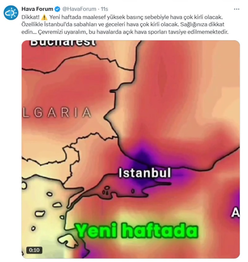 Hava Forum paylaşımında, "Yeni haftada maalesef yüksek basınç sebebiyle hava çok kirli olacak. Özellikle İstanbul'da sabahları ve geceleri hava çok kirli olacak. Sağlığınıza dikkat edin..." dedi.