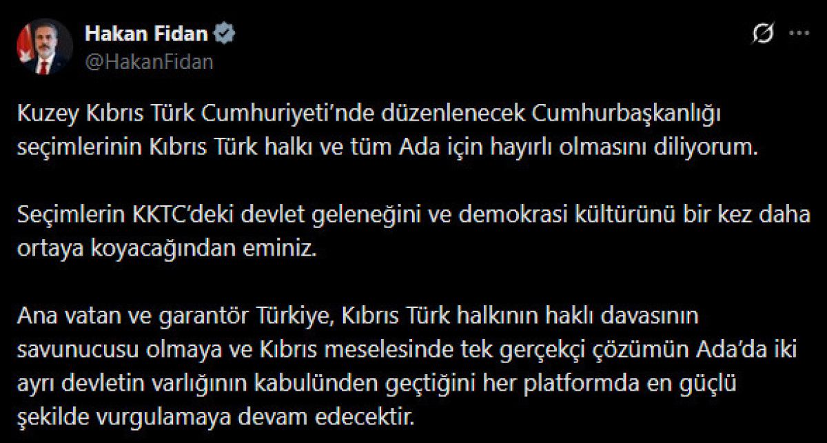 Dışişleri Bakanı Fidan yaptığı paylaşımda, "Kuzey Kıbrıs Türk Cumhuriyeti’nde düzenlenecek Cumhurbaşkanlığı seçimlerinin Kıbrıs Türk halkı ve tüm Ada için hayırlı olmasını diliyorum. Seçimlerin KKTC’deki devlet geleneğini ve demokrasi kültürünü bir kez daha ortaya koyacağından eminiz" ifadelerini kullandı.