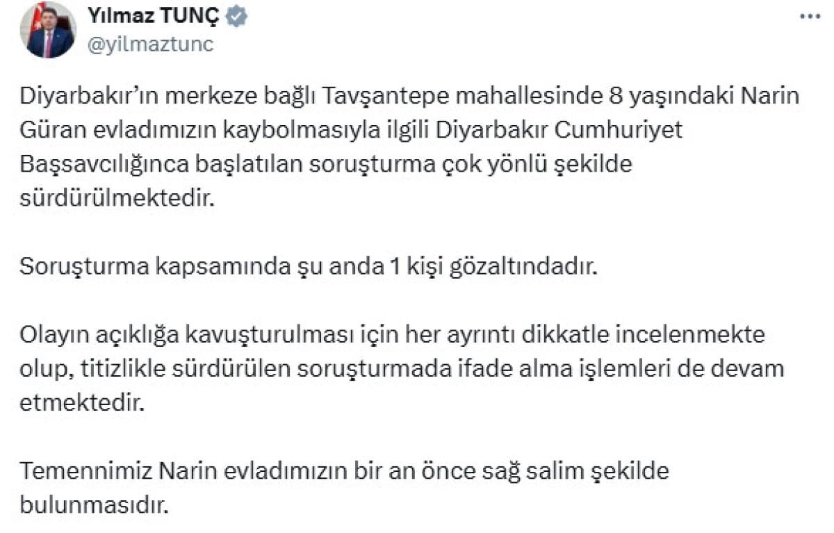 Diyarbakır’ın merkeze bağlı Tavşantepe mahallesinde 8 yaşındaki Narin Güran evladımızın kaybolmasıyla ilgili Diyarbakır Cumhuriyet Başsavcılığınca başlatılan soruşturma çok yönlü şekilde sürdürülmektedir.