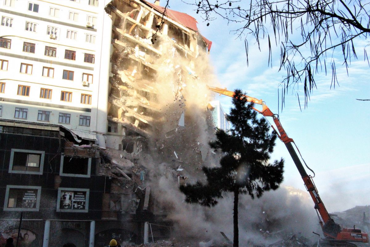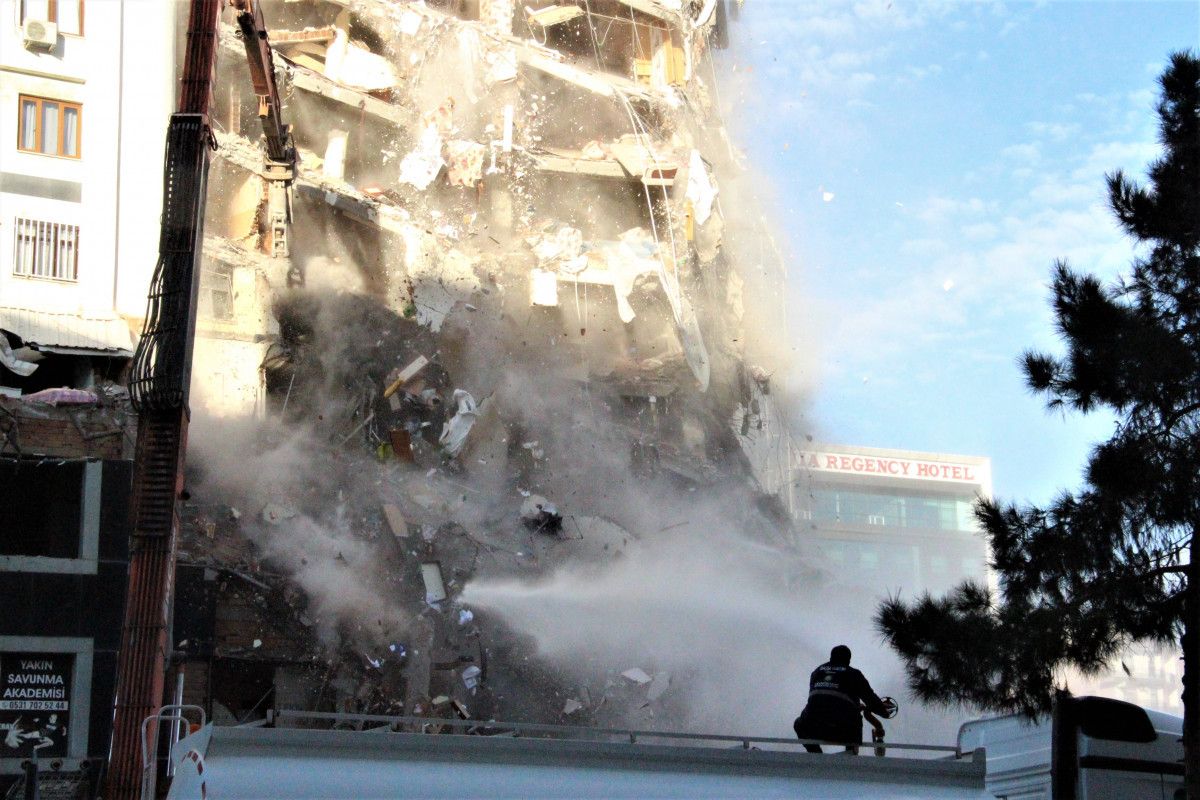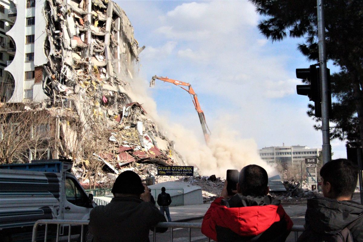 Galeria Sitesi'nin kontrollü yıkımı sırasında bir bloğu daha çökerken, ayakta kalan 2 bloğun yıkım işlemleri sürüyor. Diyarbakırlılar ise anılarla dolu AVM'nin yıkımını hüzünle seyredip, cep telefonu ile görüntü çekiyor.