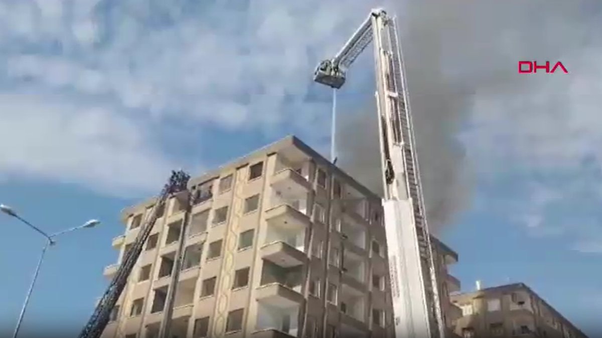 Kahramanmaraş merkezli 6 Şubat 2023’teki depremde ağır hasar görerek boşaltılan Bağlar ilçesi Turgut Özal Bulvarı üzerindeki 7 katlı binanın çatısında, öğle saatlerinde henüz bilinmeyen bir nedenle yangın çıktı.