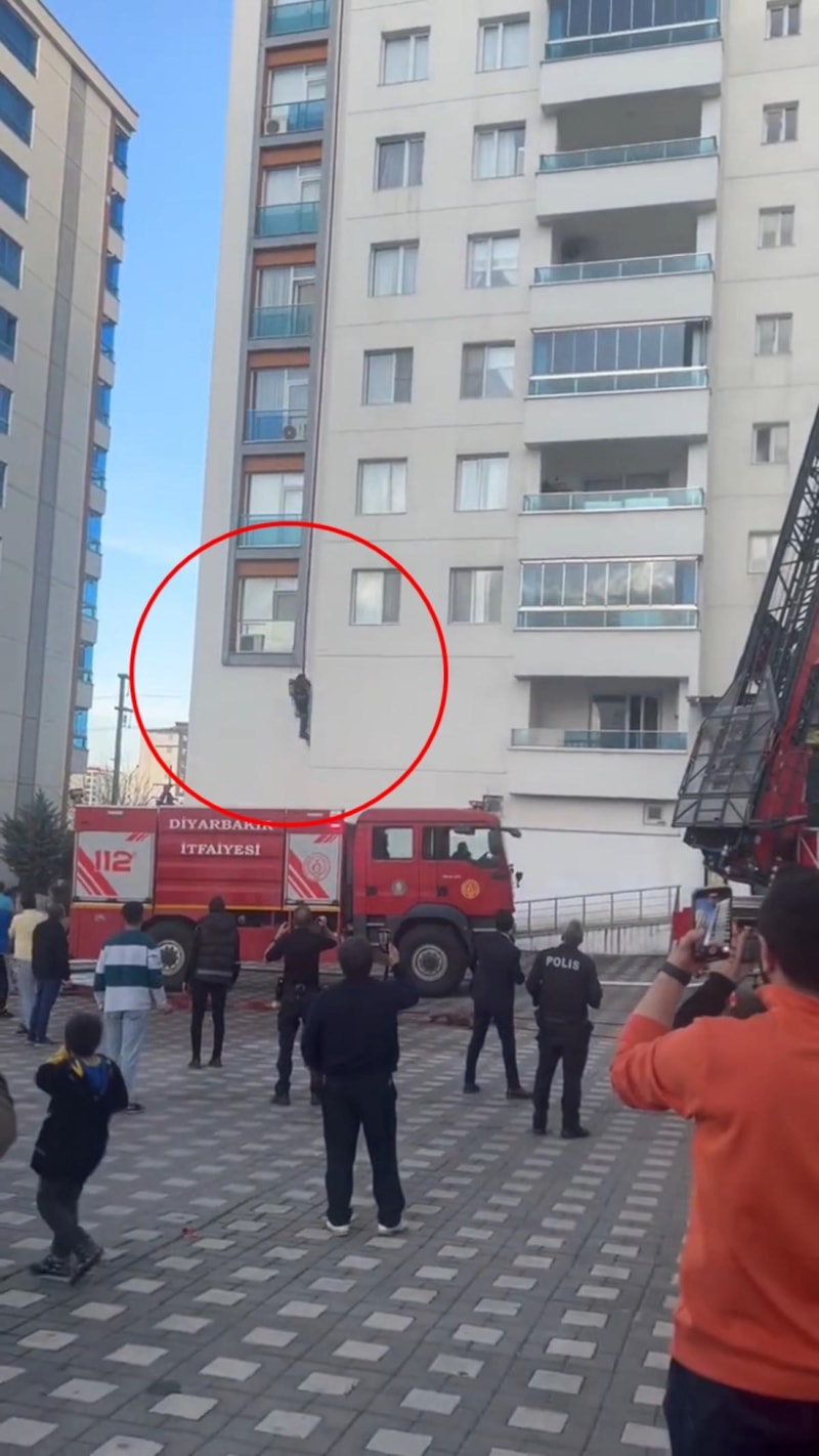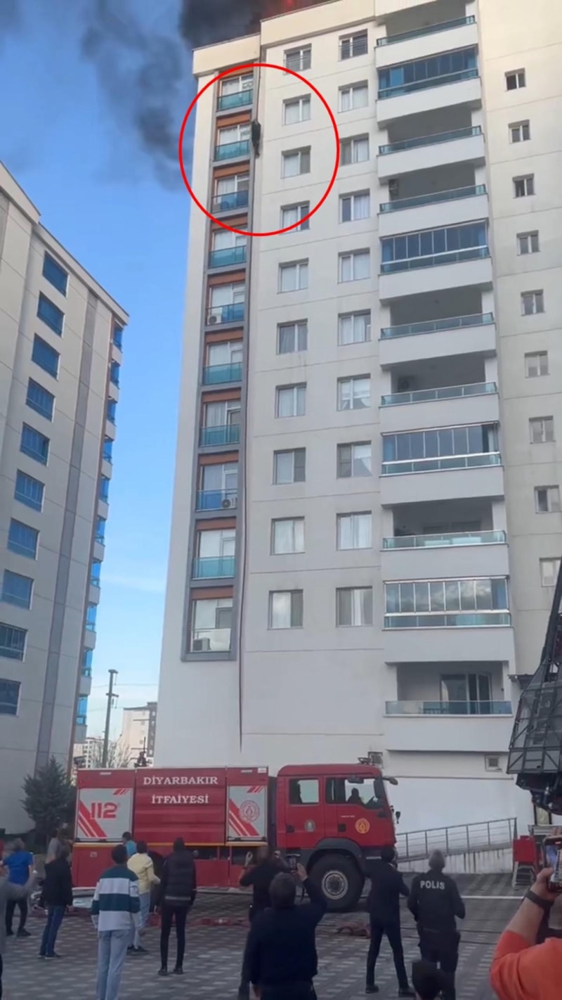 Kayapınar ilçesinde 11 katlı binanın çatısında çıkan yangına müdahale ederken alevler arasında kalınca itfaiye hortumuna tutunarak aşağıya inmeye çalışan itfaiye eri metrelerce yükseklikten düşerek ayağı kırıldı.