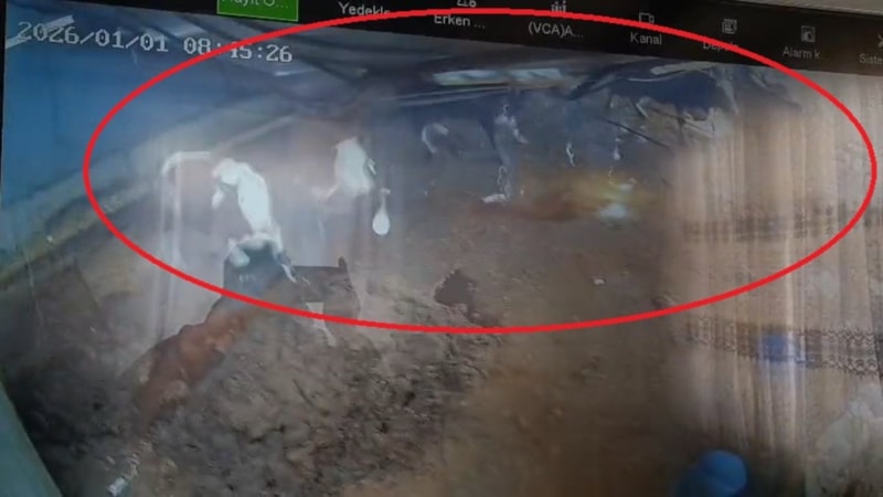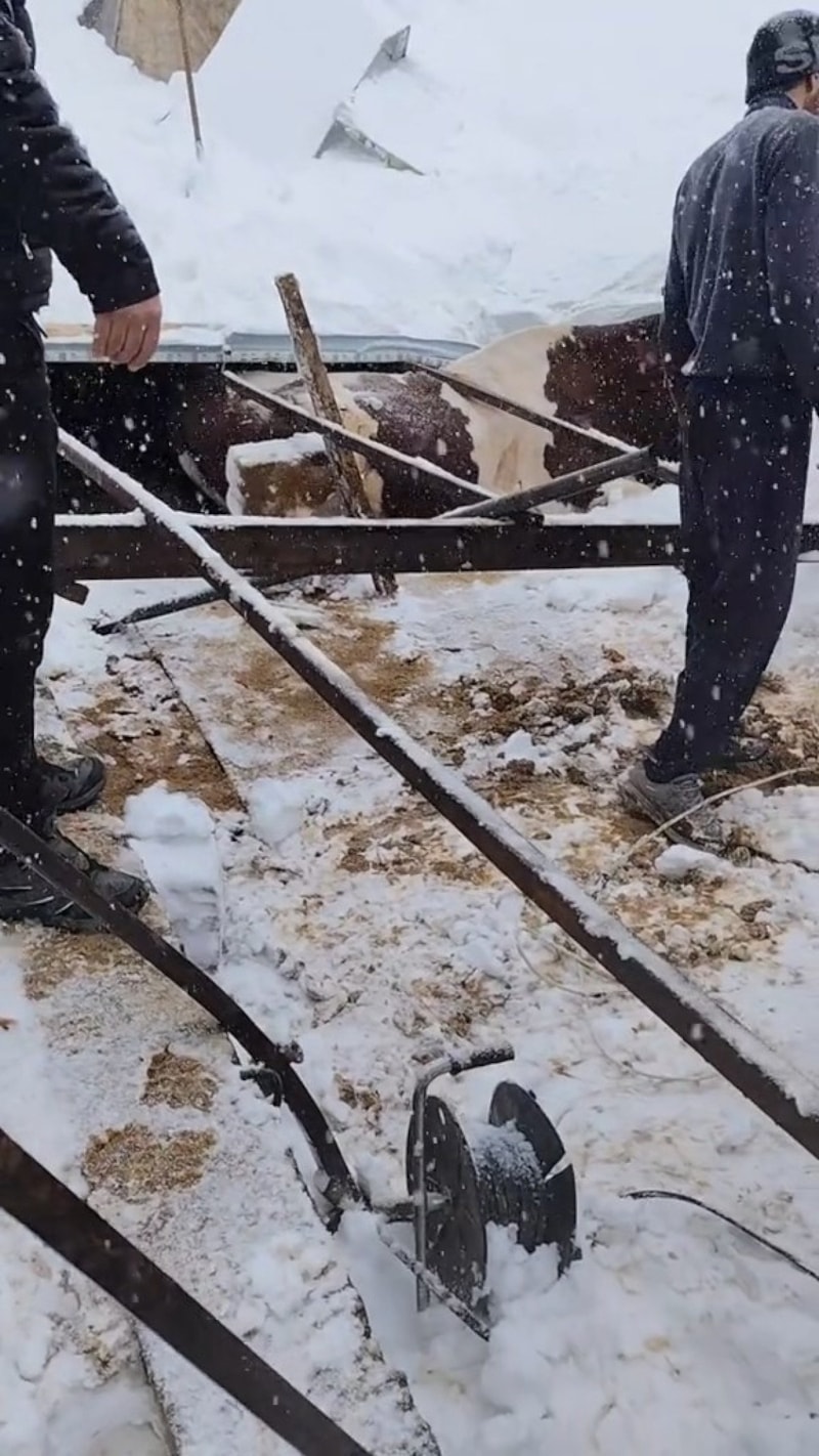 Görüntülerde, çatının çöktüğü, ahırdaki hayvanların kaçmaya çalıştıkları yer aldı.