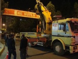 Demir kesme aletleri ile yerinden sökülen kentin simgesi karpuz maketinin ardından 'Ne mutlu Türküm diyene' yazısının bulunduğu tabela kesilmeye başlandı. Çevreden geçen vatandaşlar, yazının kaldırıldığını görünce cep telefonlarına sarılarak çalışmaları çekmeye çalıştı.