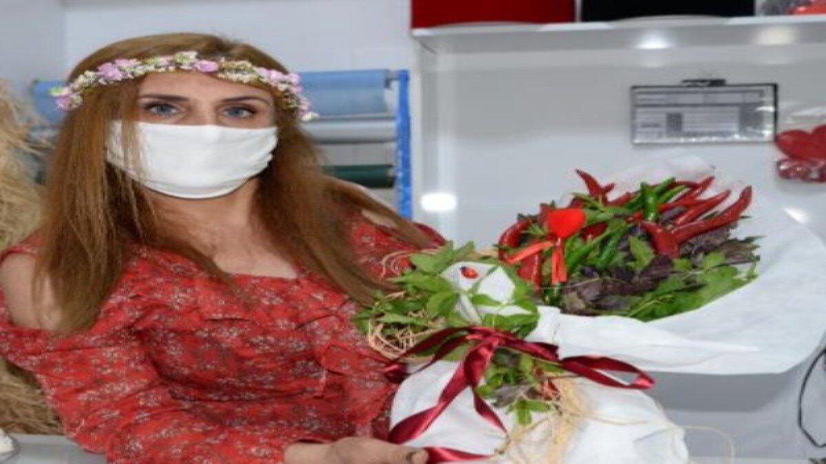 18 yıldır Diyarbakır'da çiçekçilik yapan kadın esnaf, bir müşterisinin çiçek yerine acı biber demeti sipariş etmesinin ardından, acı biber demeti siparişleri almaya başladı.