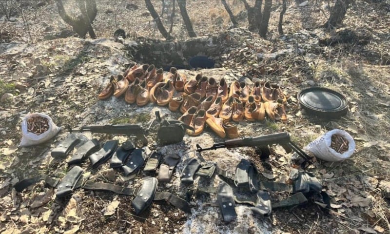 Toprak altından ayrıca 17 çift ayakkabı, 17 şarjör kütüklüğü, 3 palaska ve 1 siyah el çantası ele geçirildi.