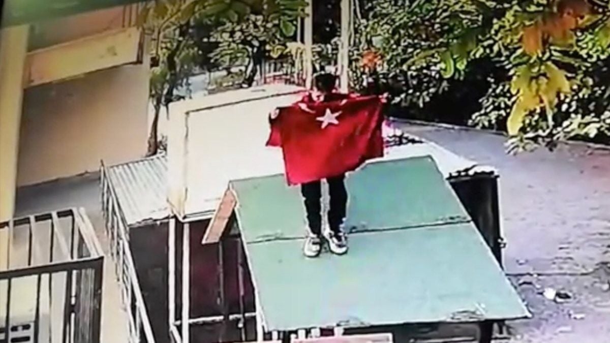 Güvenlik kameralarını incelemeye alan ekipler, bir çocuğun kuruma ait Türk bayrağını direkten indirip öptükten sonra arkadaşlarına verdiğini tespit etti.