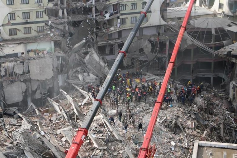 İş merkezinin enkazından 2 ölü, 106 vatandaş çıkartılmıştı. Öğlen saatlerinde ikinci artçı sarsıntıyla birlikte bloklarında birinin daha çökmesiyle çalışmalara ara verilmişti. Güvenlik gerekçesiyle ara verilen enkaz alanında çalışmalara yeniden başlandı.