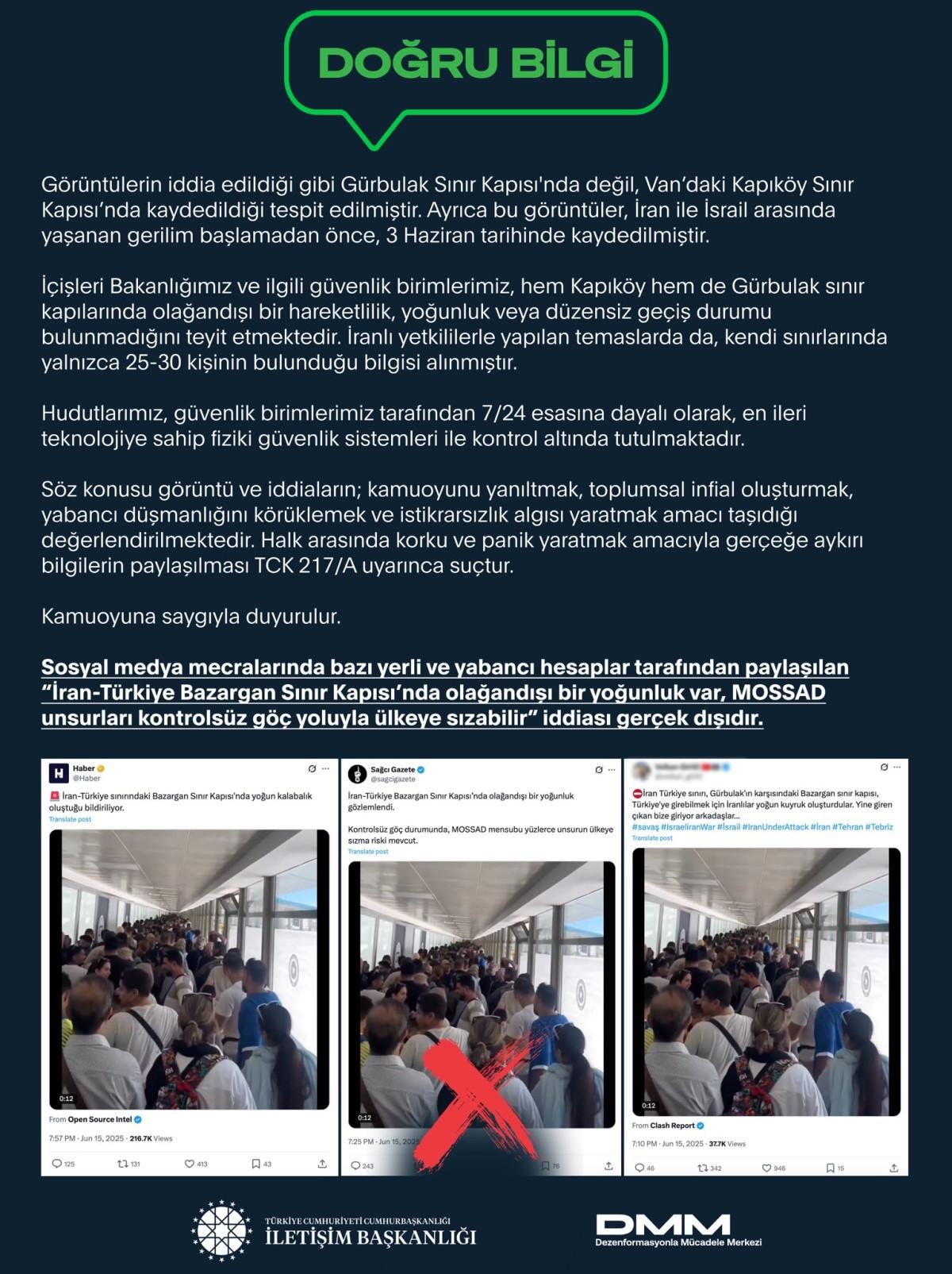 Dezenformasyonla Mücadele Merkezi (DMM), sosyal medya hesabından paylaşım yaparak, sosyal medya mecralarında bazı yerli ve yabancı hesaplar tarafından paylaşılan ‘İran-Türkiye Bazargan Sınır Kapısı’nda olağandışı bir yoğunluk var, MOSSAD unsurları kontrolsüz göç yoluyla ülkeye sızabilir’ iddiasının gerçek dışı olduğunu bildirdi.
