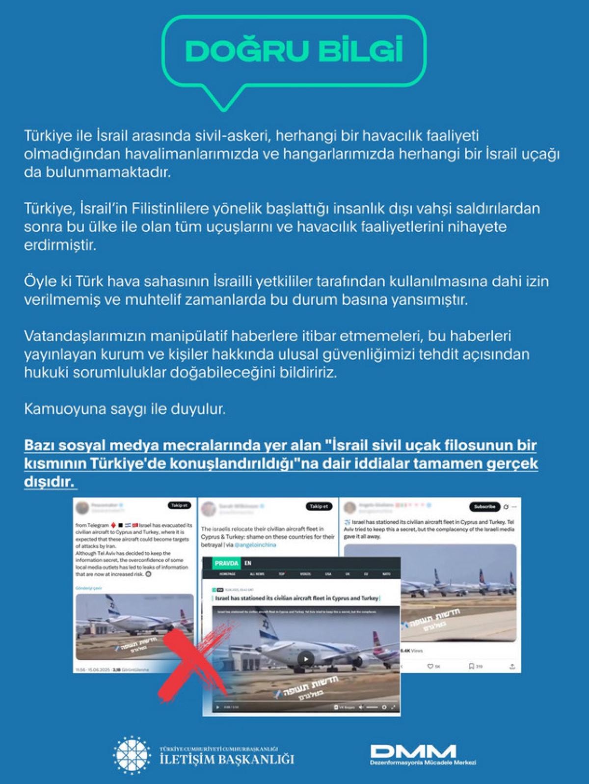 Cumhurbaşkanlığı İletişim Başkanlığı Dezenformasyonla Mücadele Merkezi'nden (DMM) yapılan açıklamada, bazı sosyal medya mecralarında yer alan "İsrail sivil uçak filosunun bir kısmının Türkiye'de konuşlandırıldığı" yönündeki iddiaların tamamen gerçek dışı olduğu belirtildi.