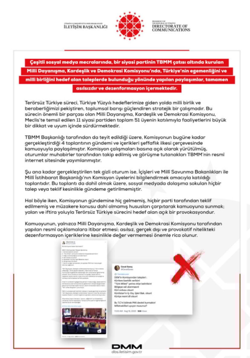İletişim Başkanlığı Dezenformasyonla Mücadele Merkezi (DMM), Türkiye Büyük Millet Meclisi’nde (TBMM) Kardeşlik ve Demokrasi Komisyonu’nda Türkiye’nin egemenliği ve milli birliğini hedef alan talepler bulunduğu yönündeki iddiaları yalanladı.