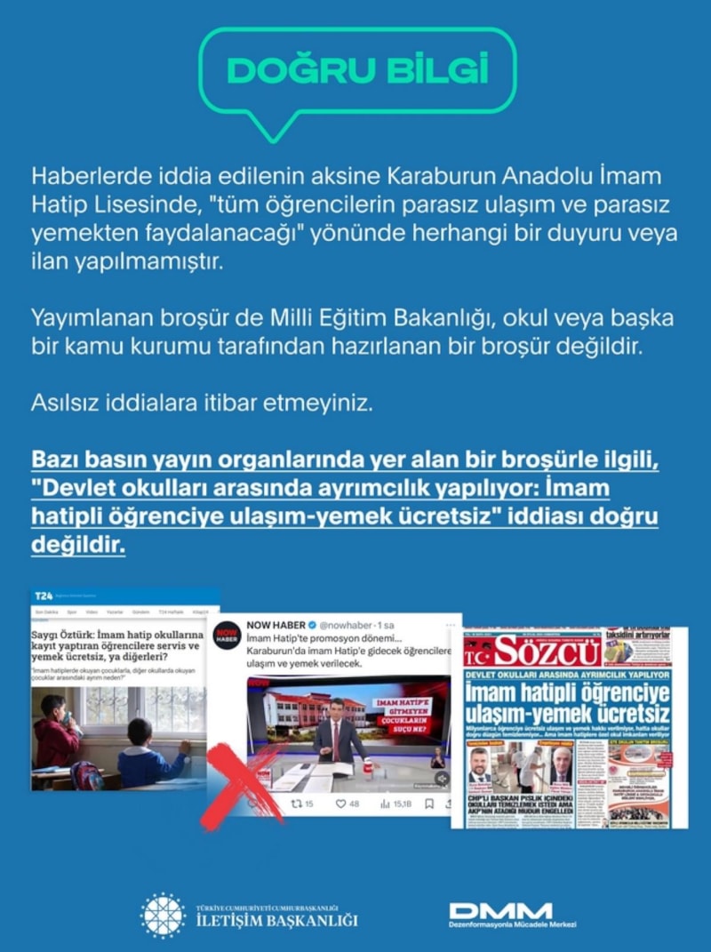 DMM broşürlerle ilgili, "Devlet okulları arasında ayrımcılık yapılıyor: İmam hatipli öğrenciye ulaşım-yemek ücretsiz" iddiasının paylaşıldığı belirtildi.