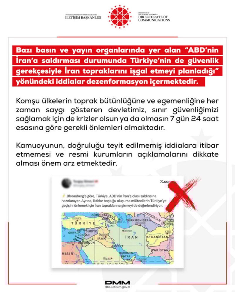 “Bazı basın ve yayın organlarında yer alan ‘ABD’nin İran’a saldırması durumunda Türkiye’nin de güvenlik gerekçesiyle İran topraklarını işgal etmeyi planladığı’ yönündeki iddialar dezenformasyon içermektedir. Komşu ülkelerin toprak bütünlüğüne ve egemenliğine her zaman saygı gösteren devletimiz, sınır güvenliğimizi sağlamak için de krizler olsun ya da olmasın 7 gün 24 saat esasına göre gerekli önlemleri almaktadır. Kamuoyunun, doğruluğu teyit edilmemiş iddialara itibar etmemesi ve resmi kurumların açıklamalarını dikkate alması önem arz etmektedir”