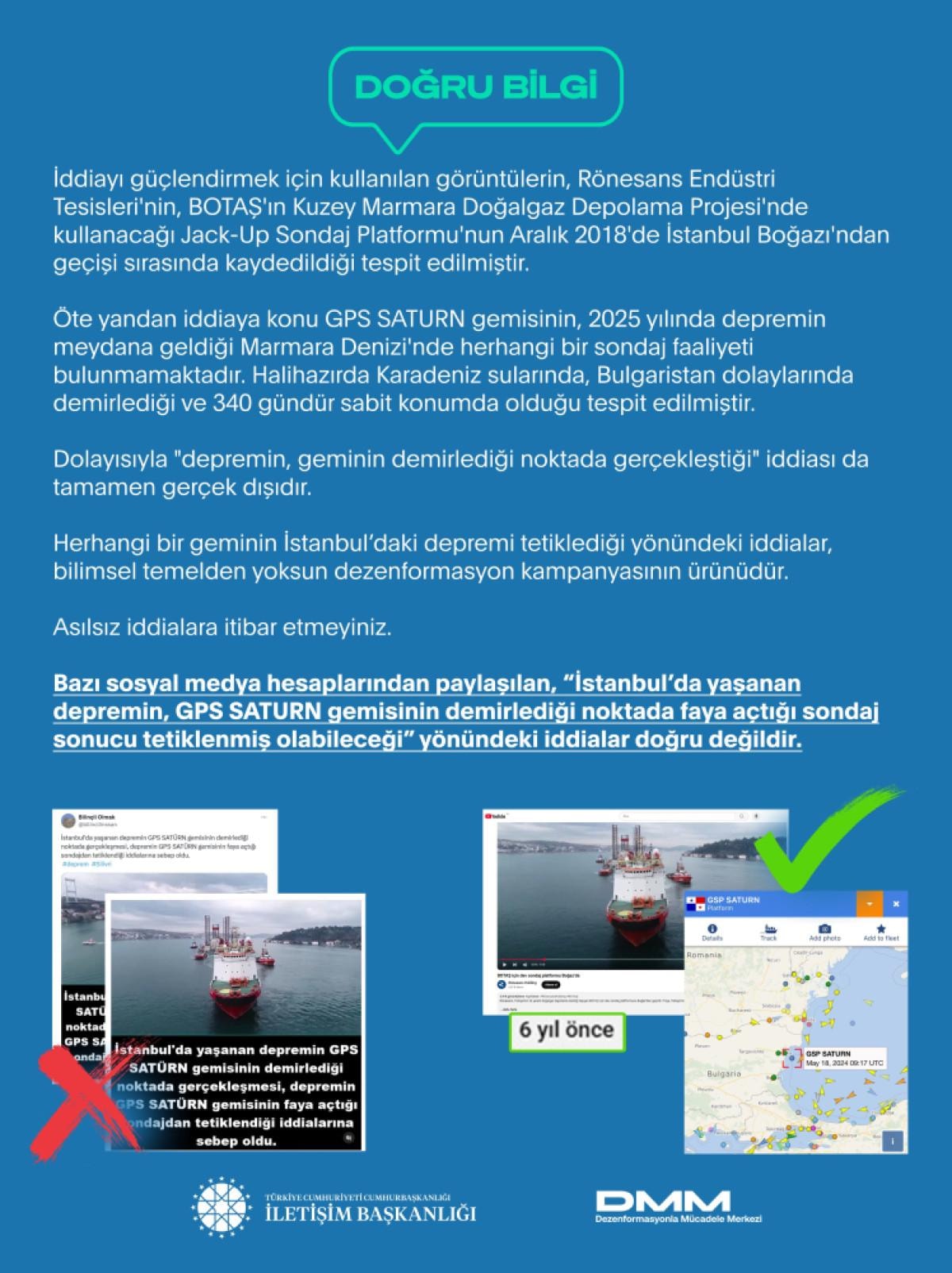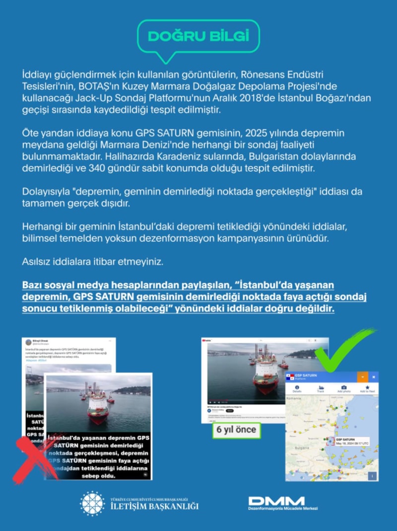İletişim Başkanlığı Dezenformasyonla Mücadele Merkezi'nden (DMM) yapılan açıklamada, bazı sosyal medya hesaplarından paylaşılan, "İstanbul'da yaşanan depremin, GPS SATURN gemisinin demirlediği noktada faya açtığı sondaj sonucu tetiklenmiş olabileceği" yönündeki iddiaların doğru olmadığı belirtildi.